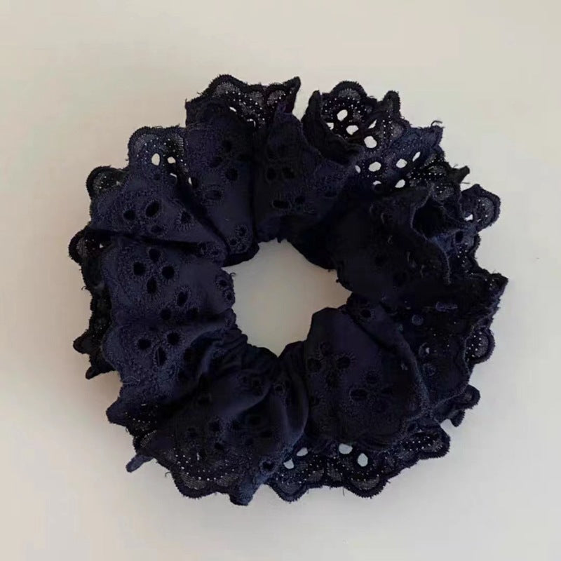 This elegant double-layer hair tie features embroidered lace with ruffled edges, creating a 3D effect. Perfect for low ponytails, it adds a romantic and sophisticated touch, inspired by popular Korean styles.