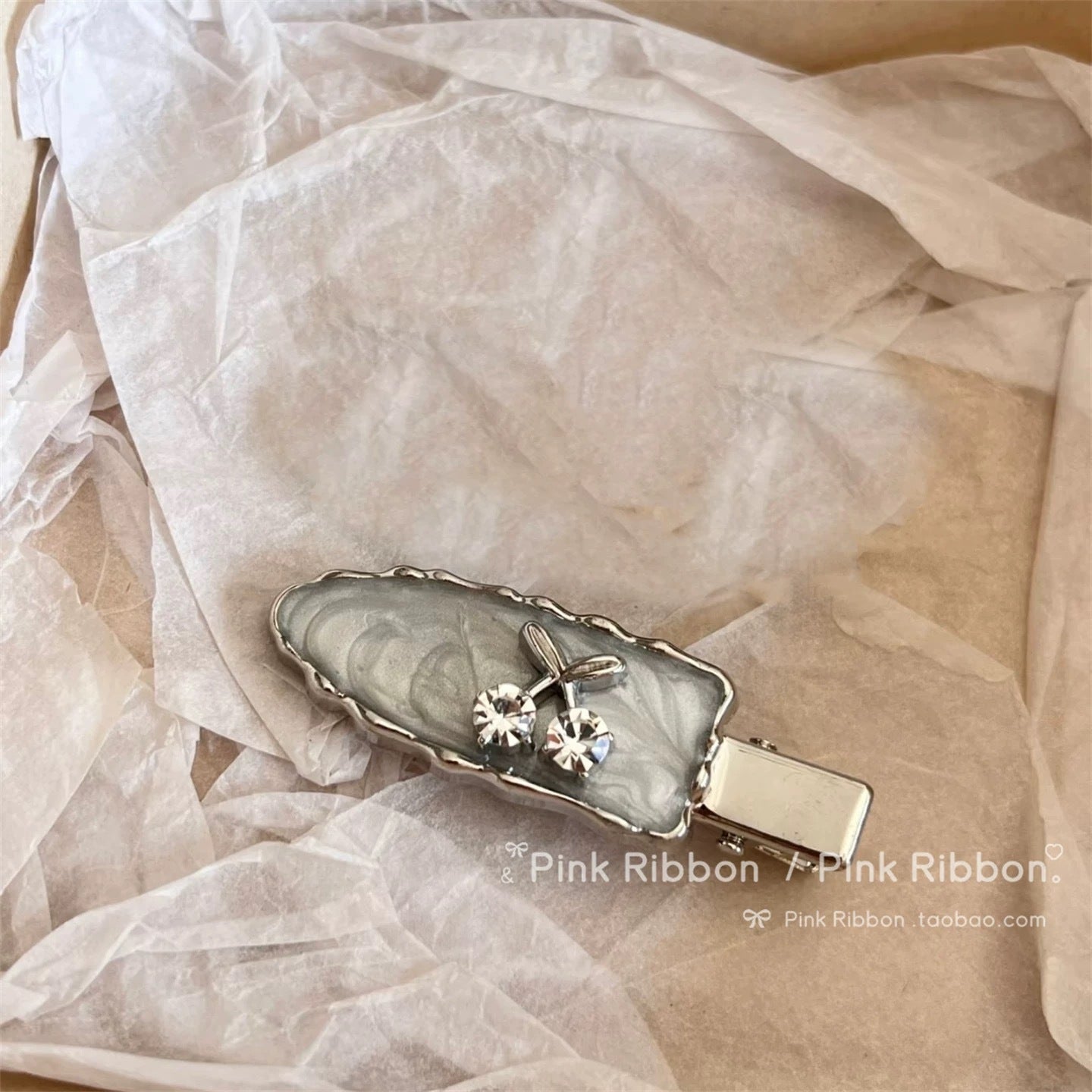 Elegant silver-gray hair clips decorated with sparkling rhinestones and delicate cherry bow details. Designed with duckbill and side clip styles, perfect for securing bangs or adding a stylish accent to everyday hairstyles.
