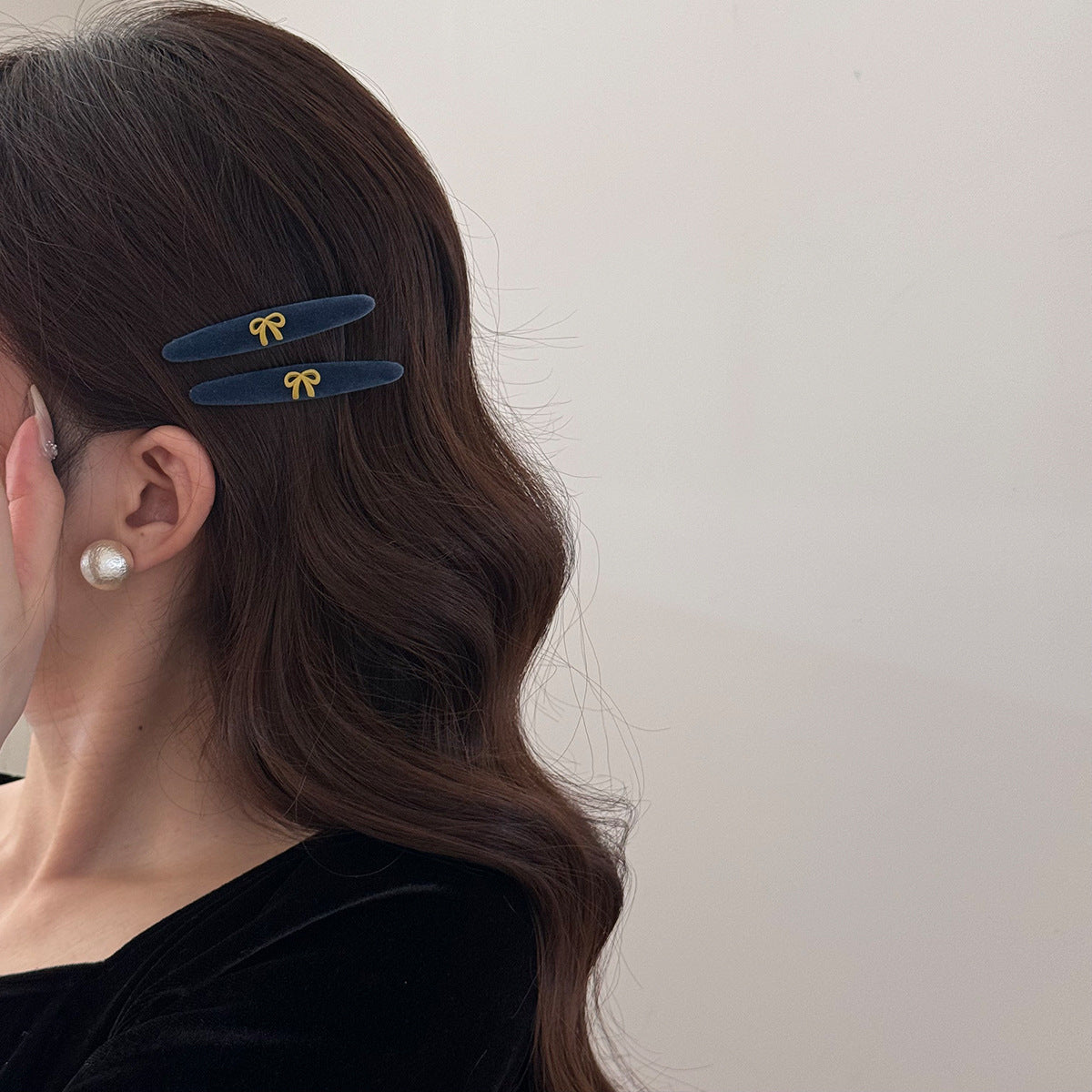 This velvet alloy bow hair clip features a chic oval design for a minimalist, stylish look. Perfect for side hair or bangs, it adds a refined and versatile touch to everyday hairstyles. Lightweight and easy to wear for all-day comfort.