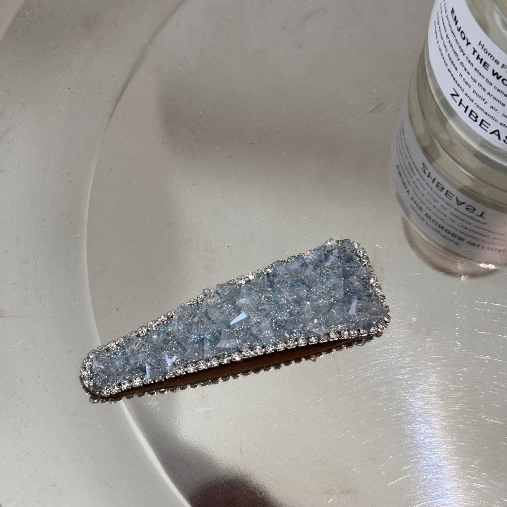 A sparkling blue hair clip adorned with full crystal detailing and a delicate bow design. Perfect for side styling or securing bangs, it adds a refined, luxe-inspired touch to both everyday and special occasion looks.