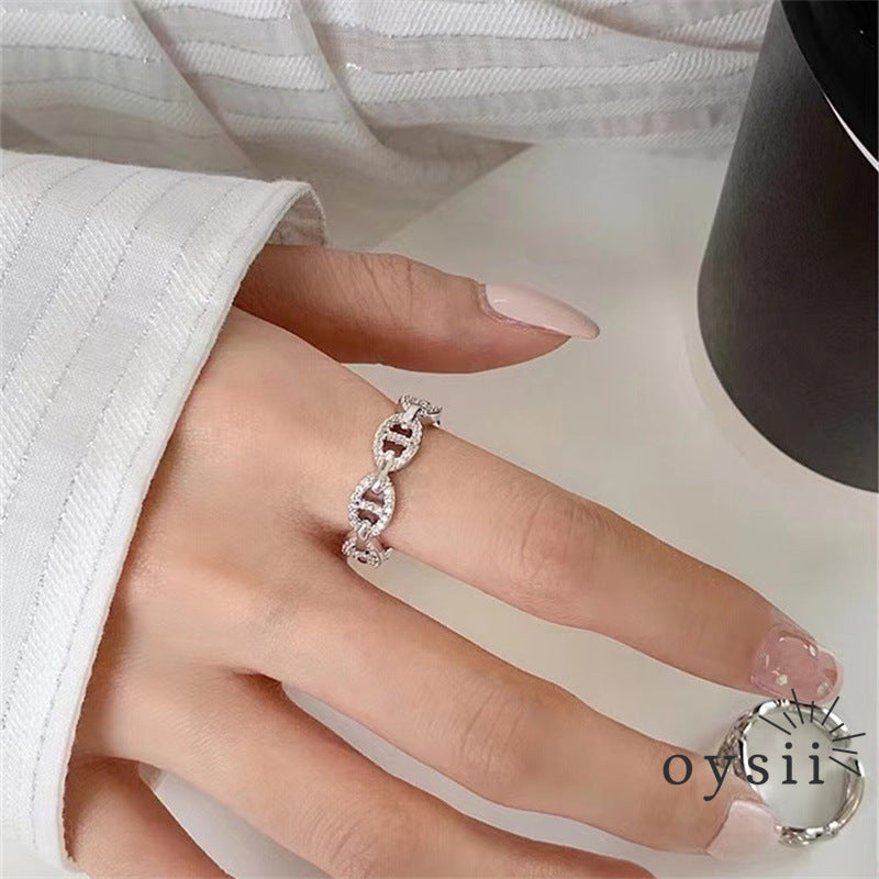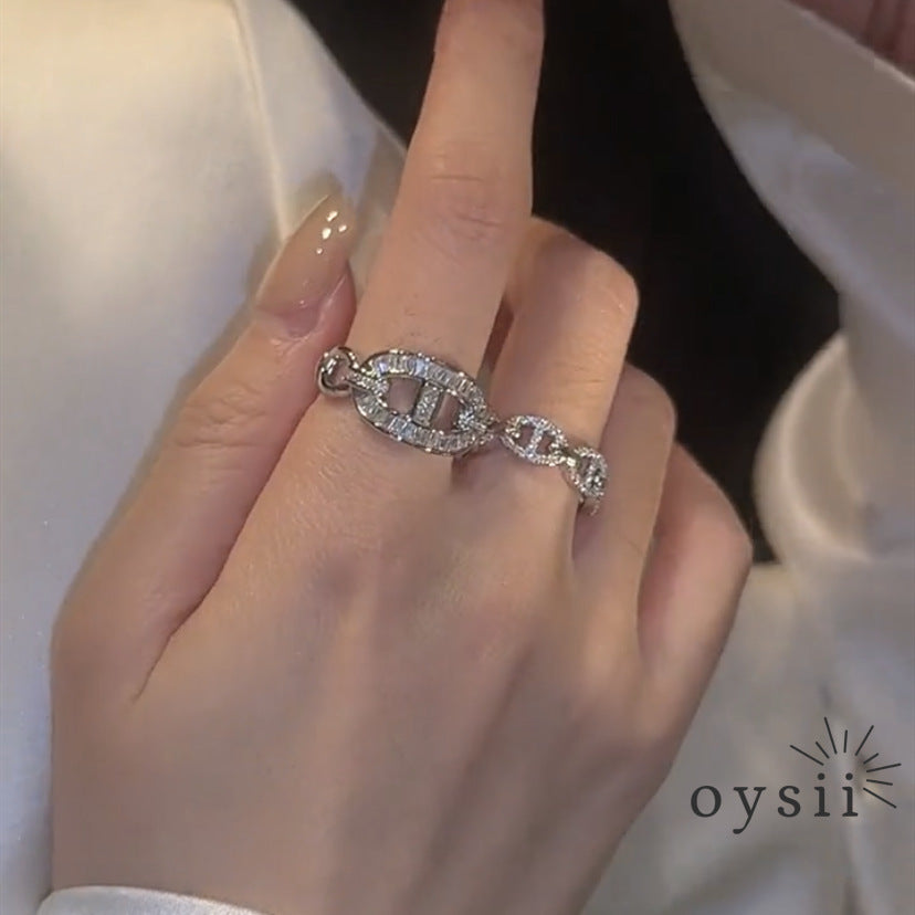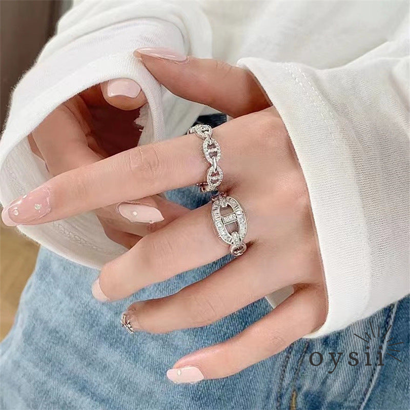 The Chic Snout ring features a playful pig nose-inspired design adorned with sparkling pavé zircon stones. Its open-band, adjustable style combines light-luxury sophistication with quirky charm, making it a distinctive, statement accessory for layering or solo wear.