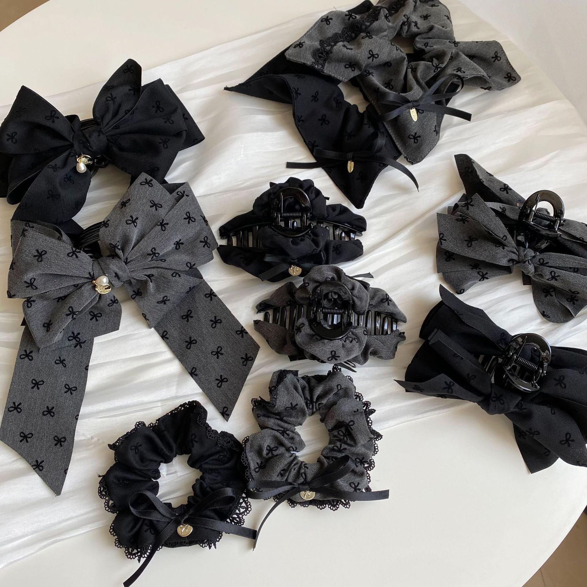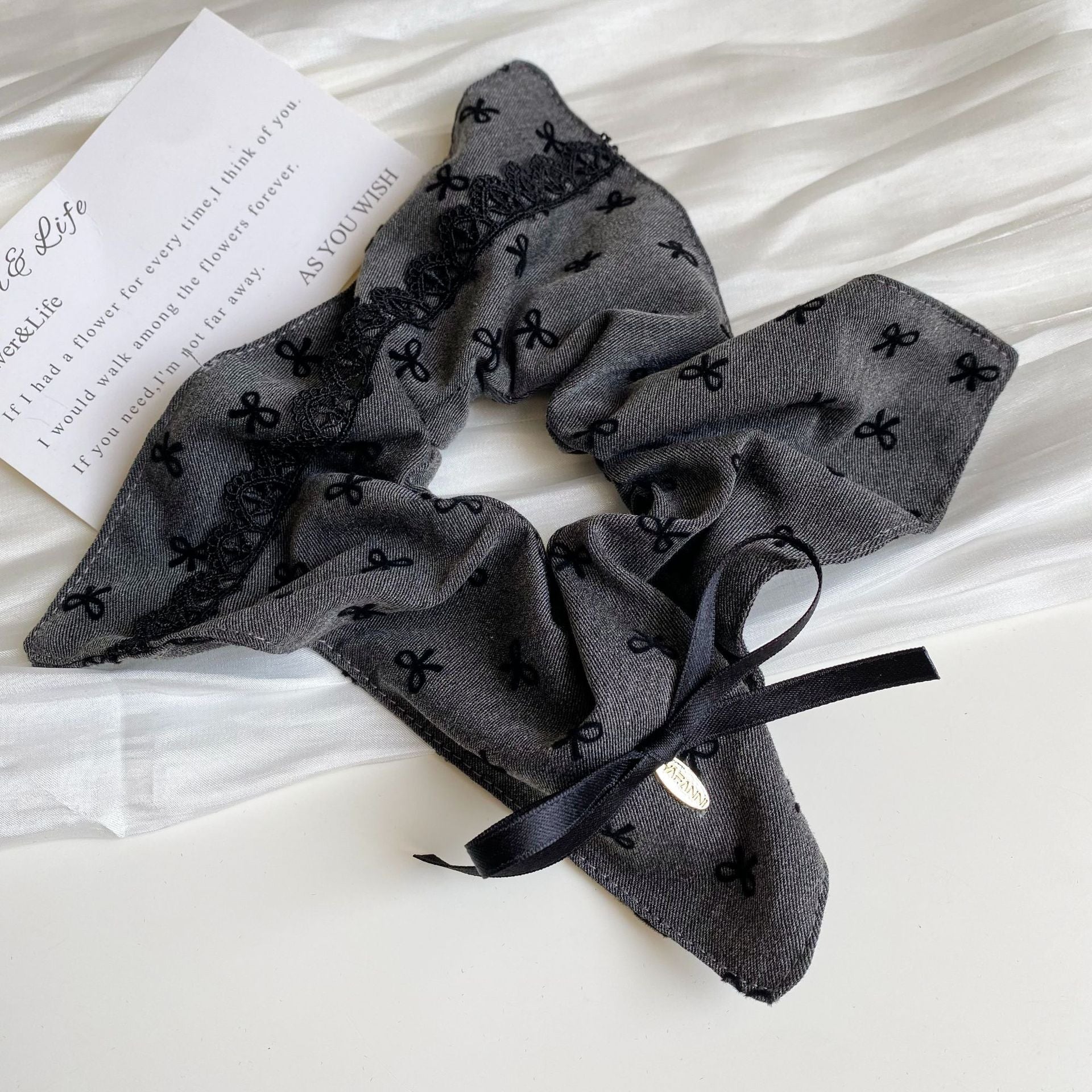 This stylish scrunchie combines a soft gray fabric with a chic bow design, perfect for creating elegant buns or ponytails. Its vintage-inspired look pairs effortlessly with hair scarves, shark clips, or other layered accessories for a refined, high-end touch.