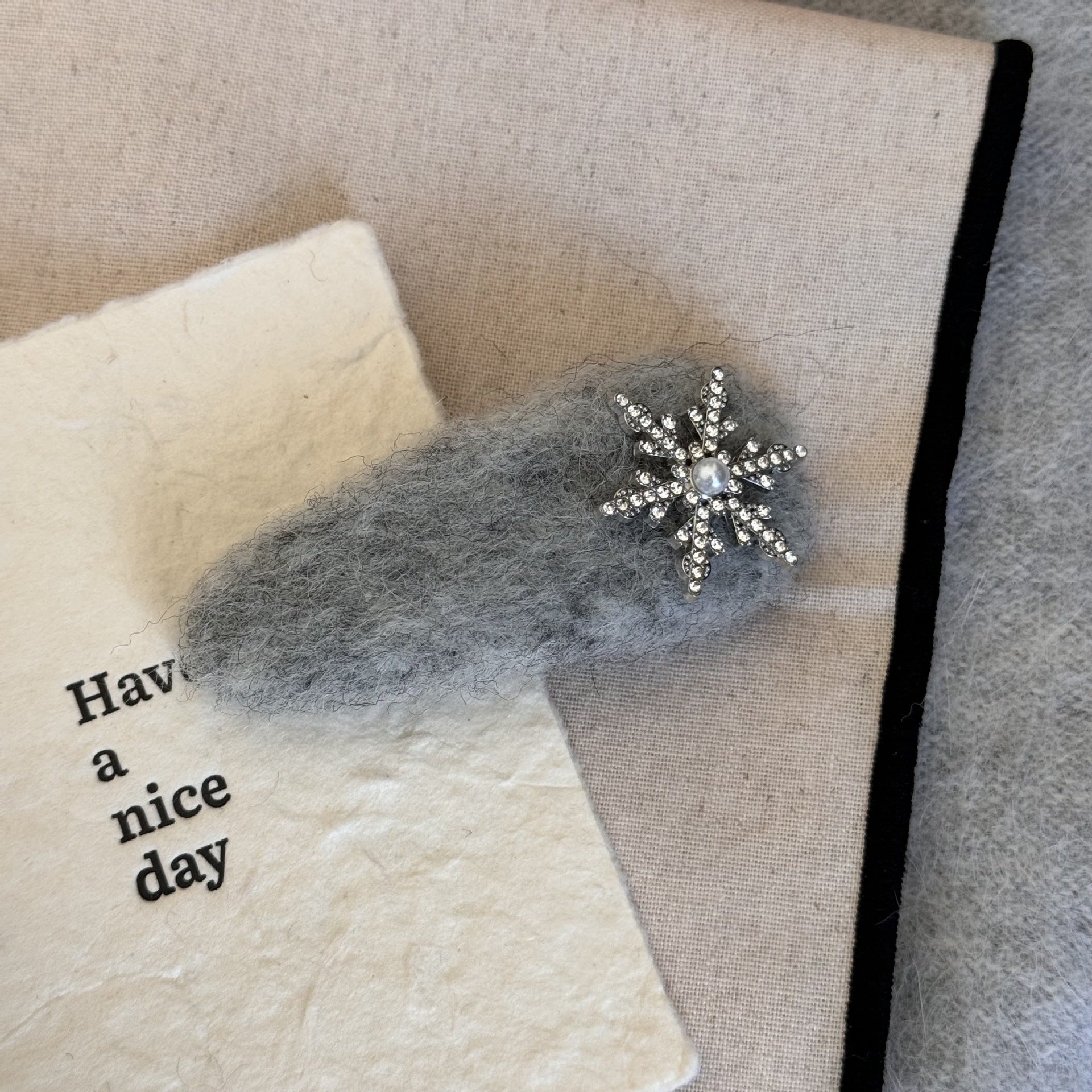 This grey fuzzy snowflake hair clip features a soft, plush texture that adds a cozy winter vibe. Perfect for styling bangs or side hair, it’s lightweight, comfortable, and ideal for fall and winter outfits with a sweet, seasonal touch.
