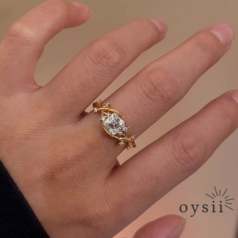 The Twilight Vine ring features a wrapped vine-inspired design adorned with sparkling square-cut crystals. Its light-luxury aesthetic combines fashion-forward elegance with delicate craftsmanship, making it a perfect statement piece for daily wear or special occasions. A sophisticated ring that effortlessly elevates any outfit.