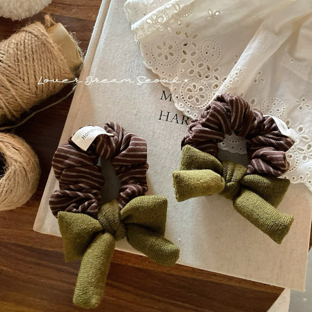 This chic scrunchie features rich brown and ginger-yellow stripes topped with an elegant bow. Designed with a soft, voluminous silhouette, it adds effortless sophistication to ponytails, buns, and everyday autumn-winter styling.