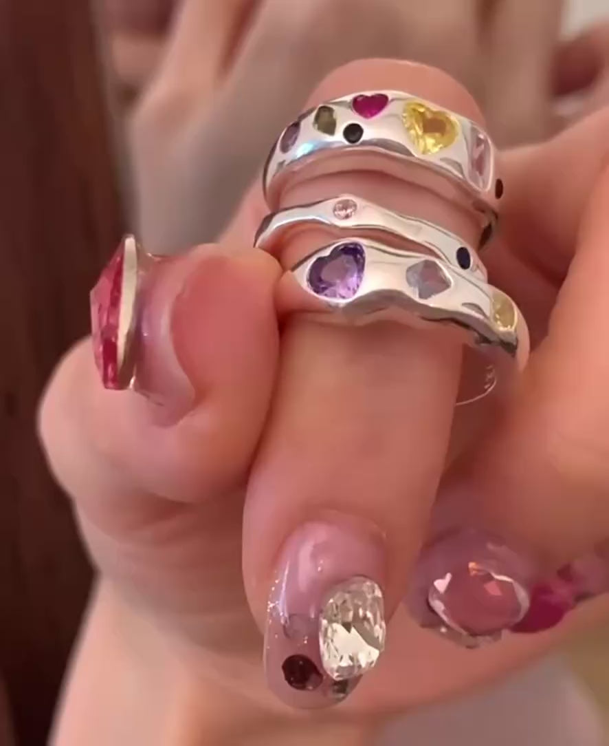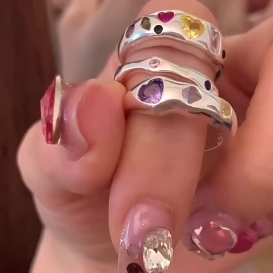 A dazzling ring featuring vibrant heart-shaped stones that symbolize love and joy. Designed with a colorful gemstone setting and a radiant finish, perfect for everyday wear or as a thoughtful gift.