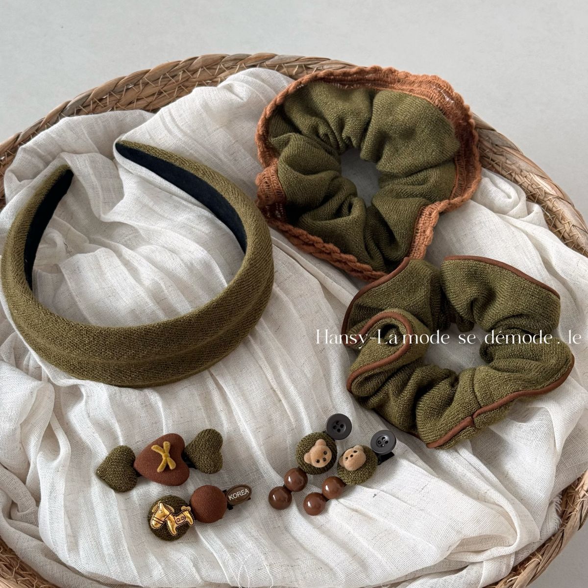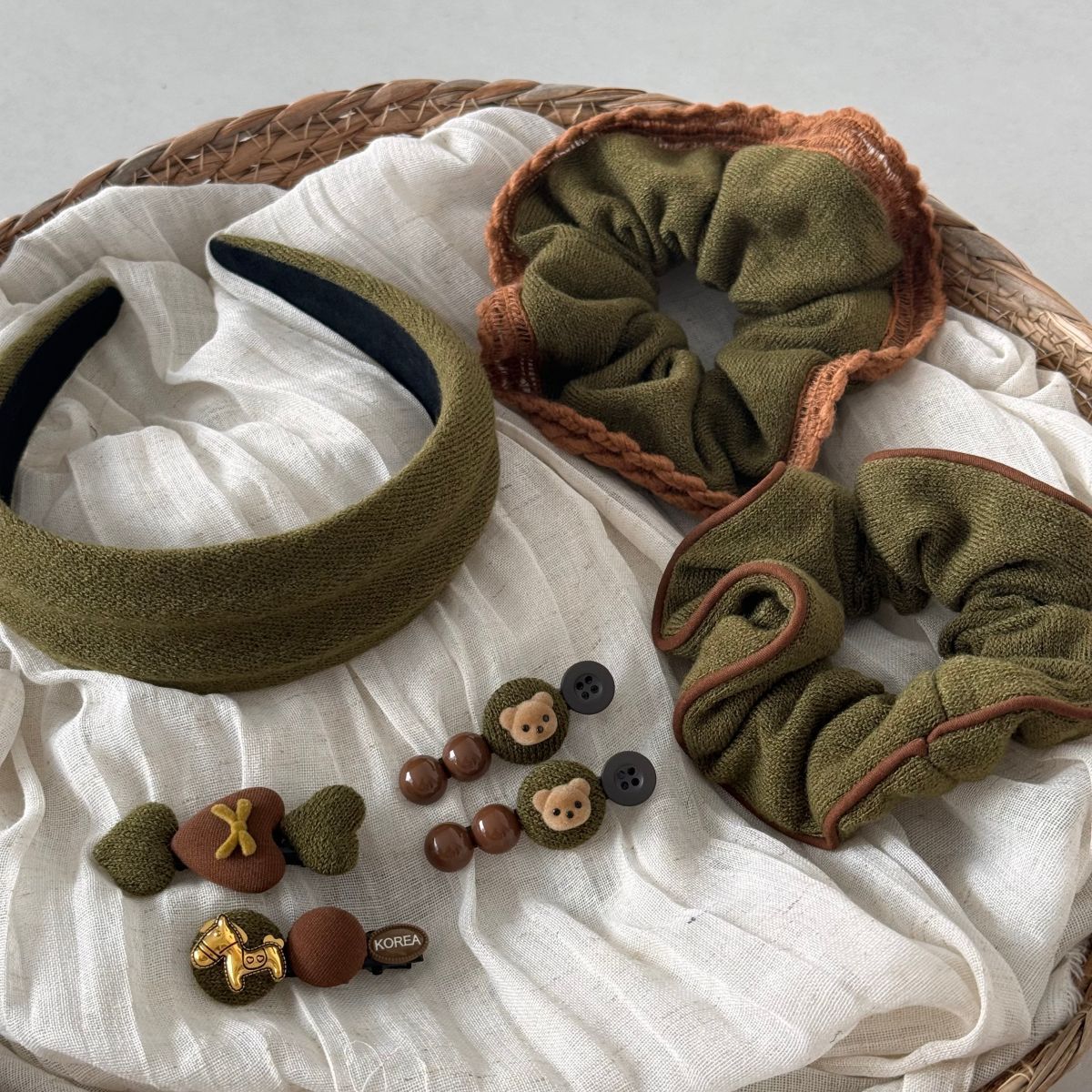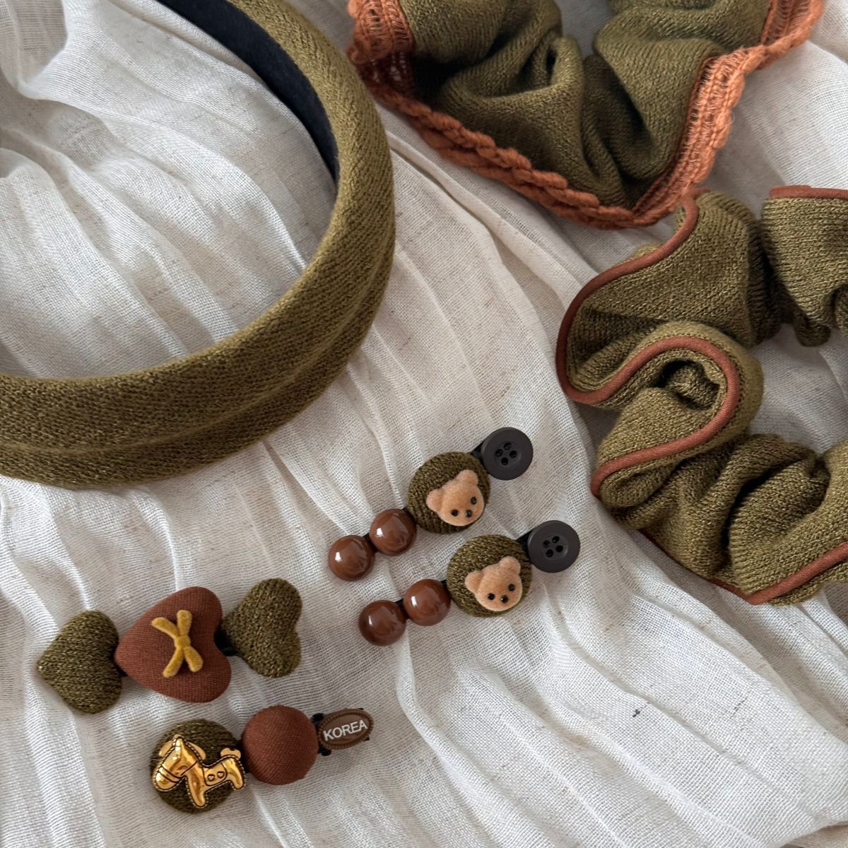 This adorable fabric hair clip features a sweet bear accent and soft pastel colors, adding a cute and stylish touch to any look. Perfect for holding bangs or securing small sections of hair, it offers a delicate yet refined aesthetic suited for everyday wear.