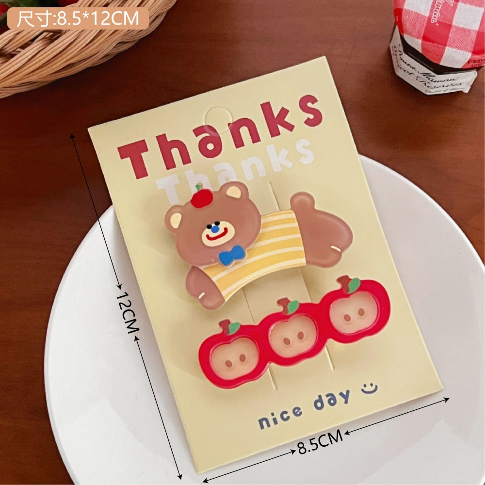 This charming acrylic hair clip set features cute cartoon pet designs, perfect for securing bangs or side hair. Lightweight and versatile, it adds a playful, youthful, and trendy touch to everyday hairstyles for girls and teens.