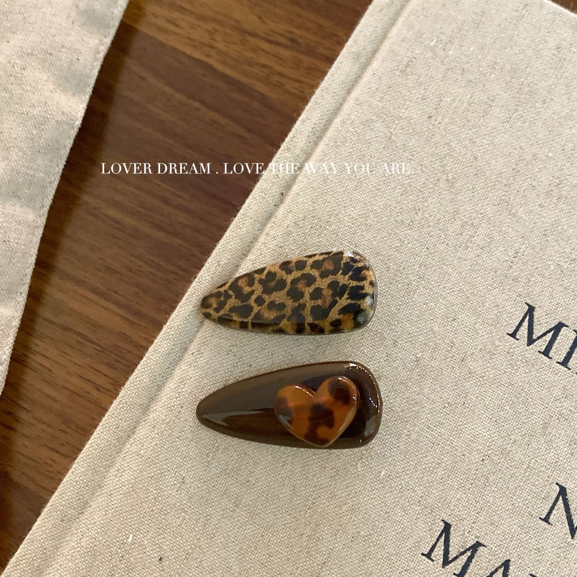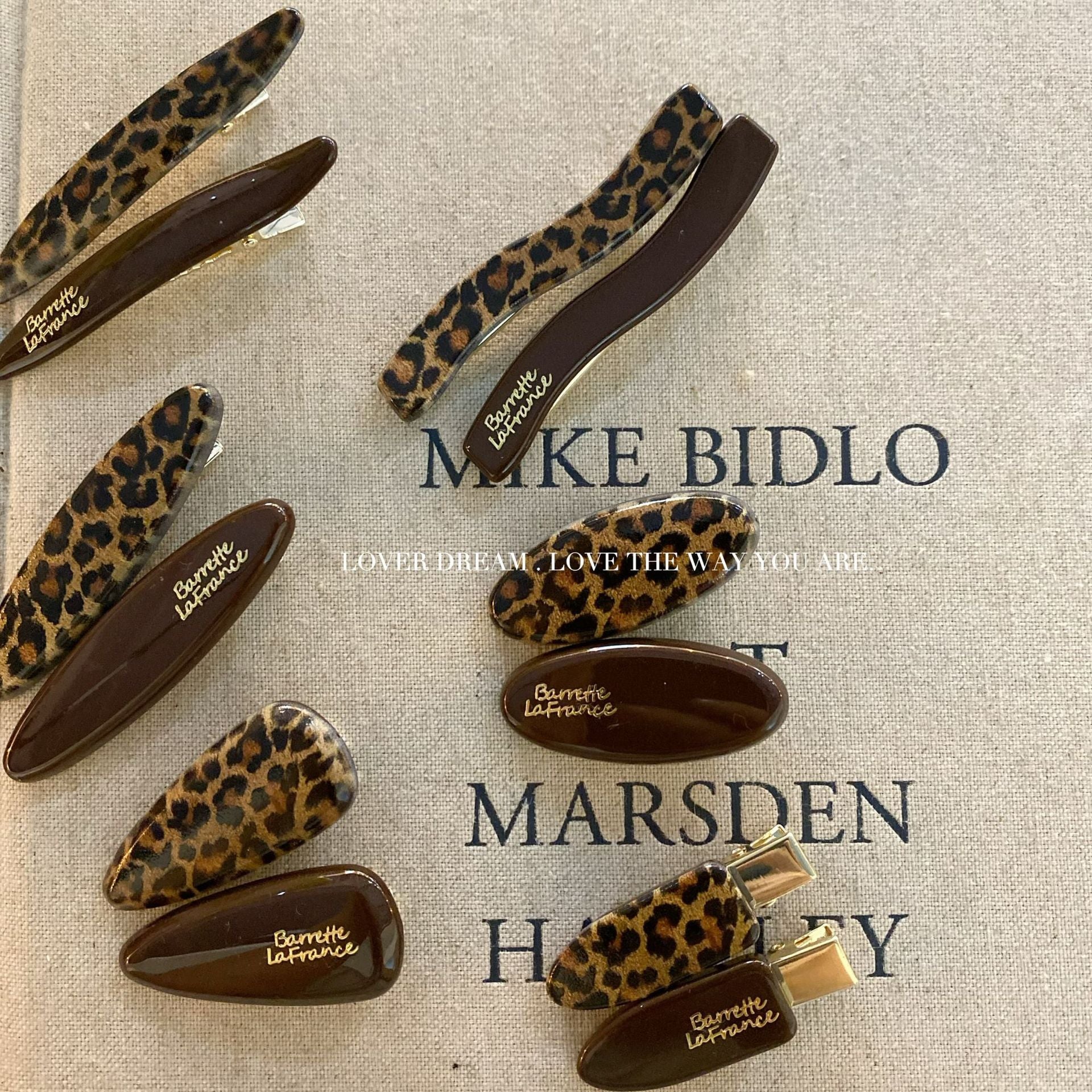 This chic hair clip features a gold letter accent with a brown leopard geometric design, combining French vintage elegance with modern style. Perfect for securing bangs or side hair, versatile for everyday wear.
