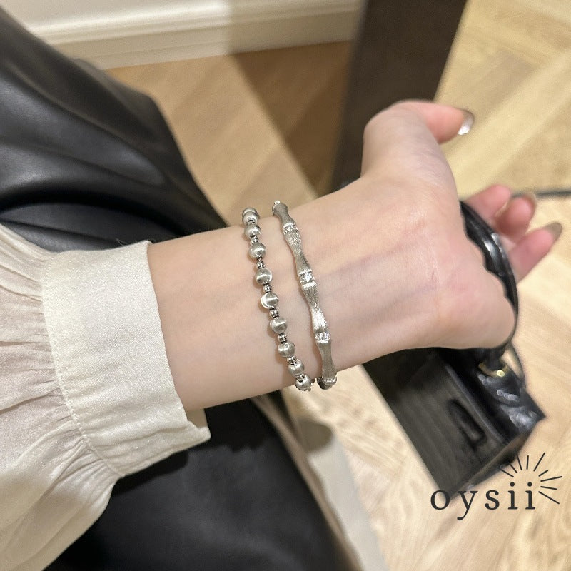 The Bamboo Serenity bangle features a refined bamboo-inspired design with a brushed gold and silver two-tone finish, blending traditional Chinese aesthetics with light-luxury elegance. Its versatile, sophisticated style makes it perfect for everyday wear or layering, adding a touch of timeless charm and graceful design to any outfit.