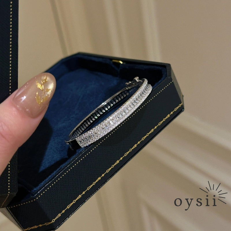 The Radiant Luxe bracelet features a dazzling array of square-cut crystals set in a silver band, combining luxurious sparkle with meticulous craftsmanship. Its light-luxury design exudes elegance and sophistication, making it perfect as a statement piece or for layering with other bracelets. A refined accessory that adds glamour and modern charm to any outfit.