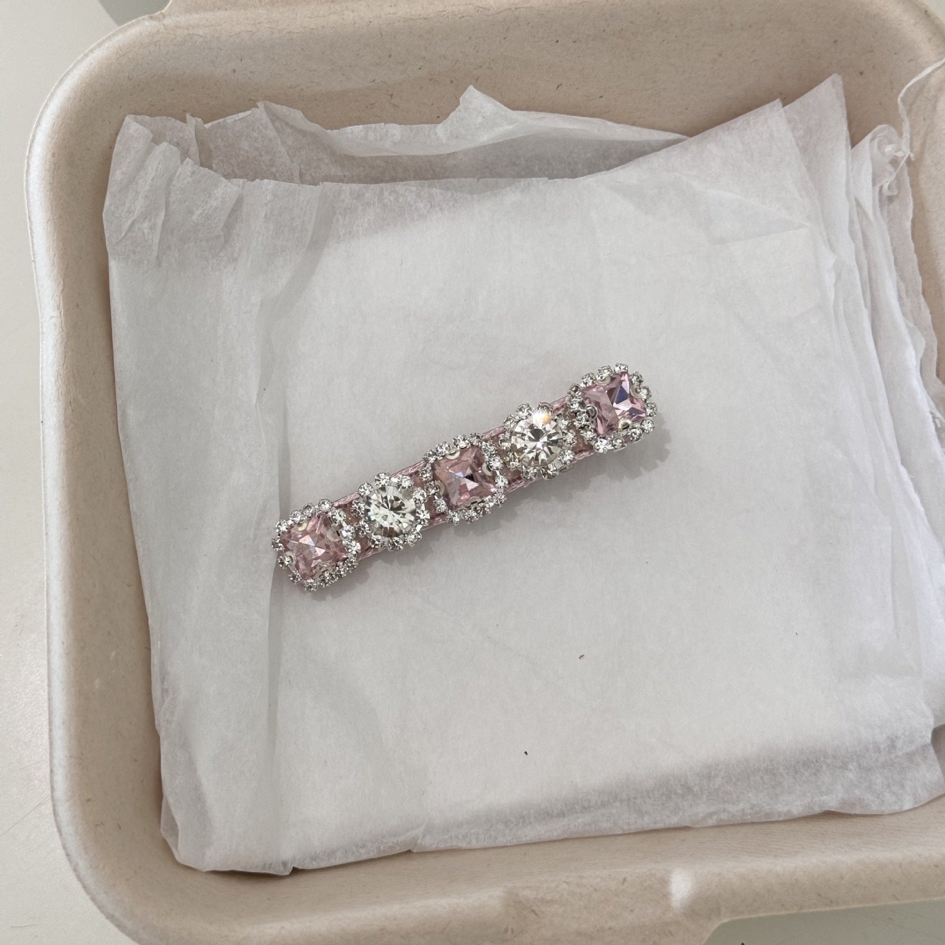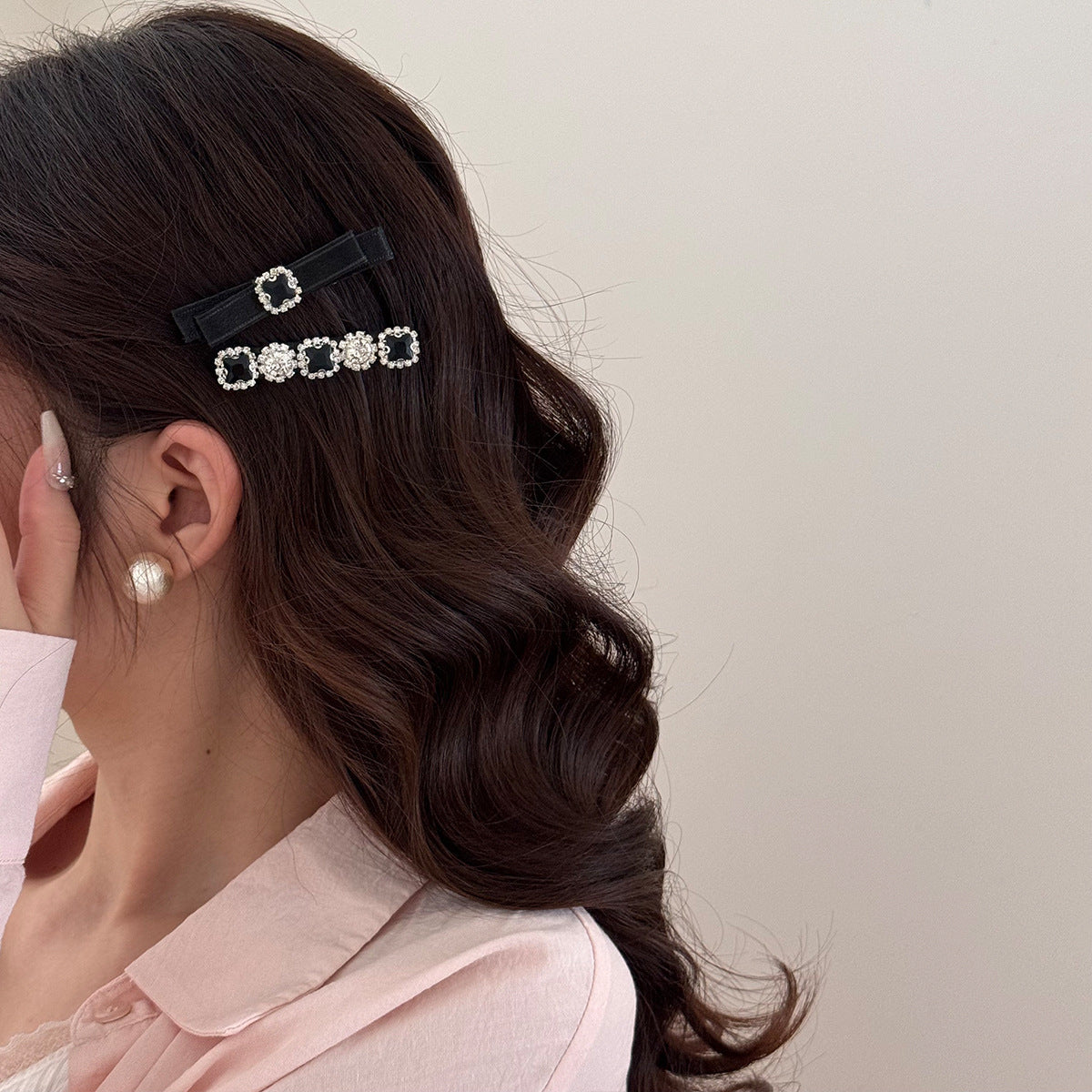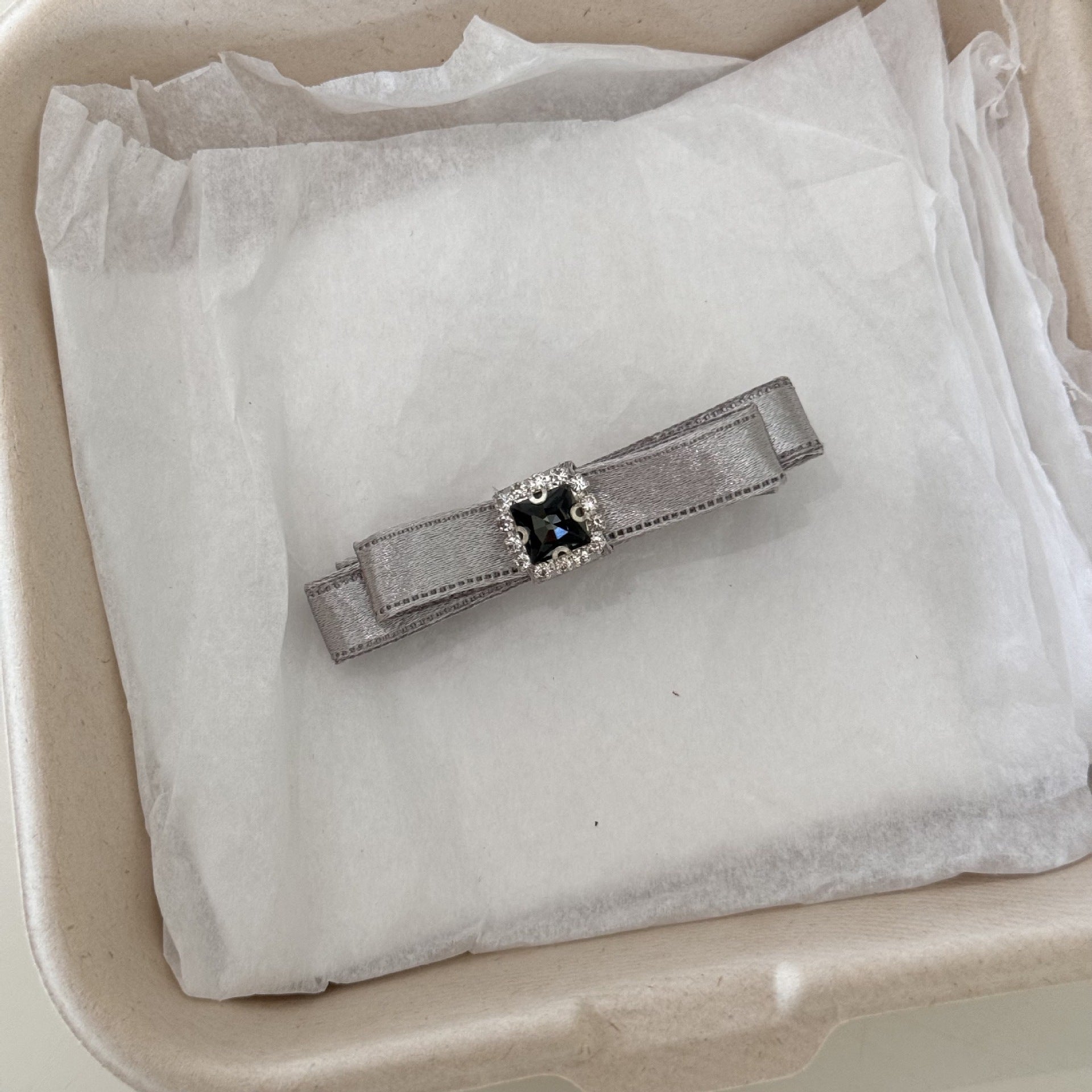 This satin bow hair clip features a lustrous stone accent for a chic, modern look. Perfect for styling bangs or side hair, it adds a touch of elegance and sophistication to everyday hairstyles or special occasions. Lightweight and easy to wear.