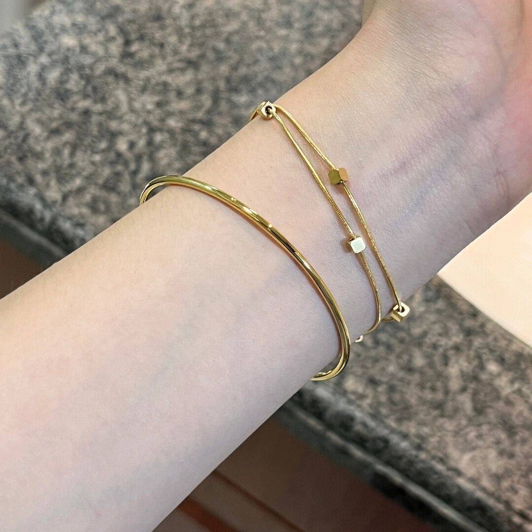 A two-piece bracelet set with square accents and double-layer design. Modern and versatile, perfect for stacking or gifting.