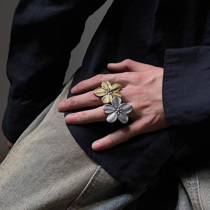 A retro-inspired open ring with an oxidized flower design. Adjustable fit for timeless vintage charm.