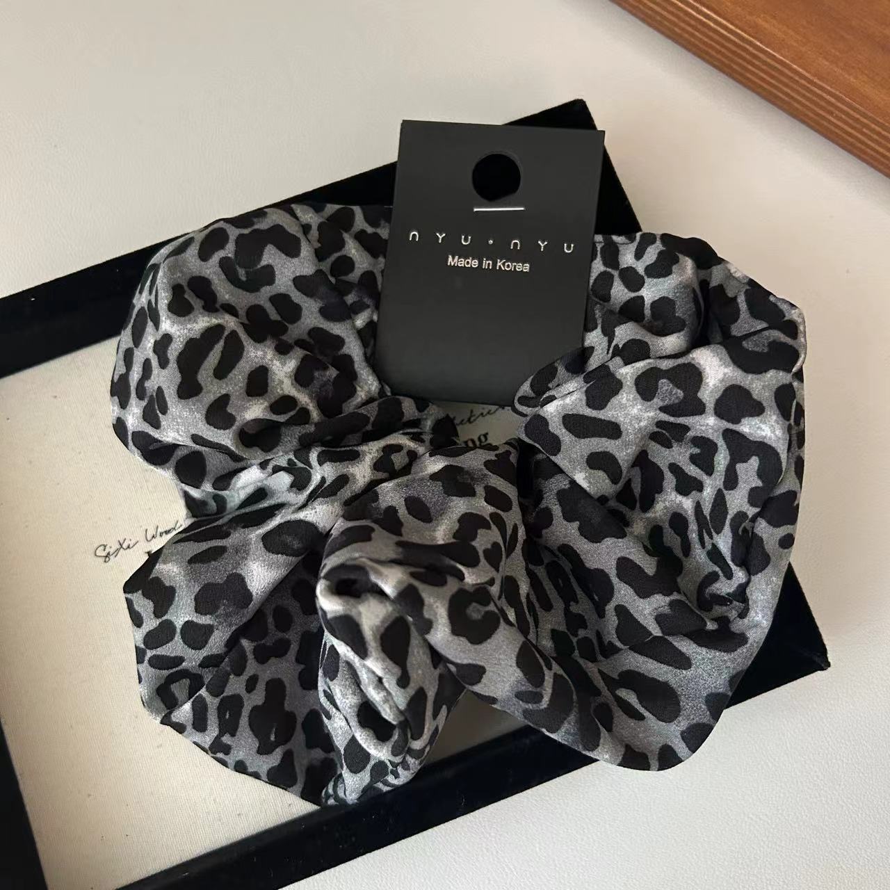This oversized fabric scrunchie features a vintage leopard print, adding a bold yet elegant touch to any hairstyle. Perfect for securing high ponytails or buns, it combines style and comfort while enhancing casual or chic looks. Ideal for autumn styling and versatile daily wear.
