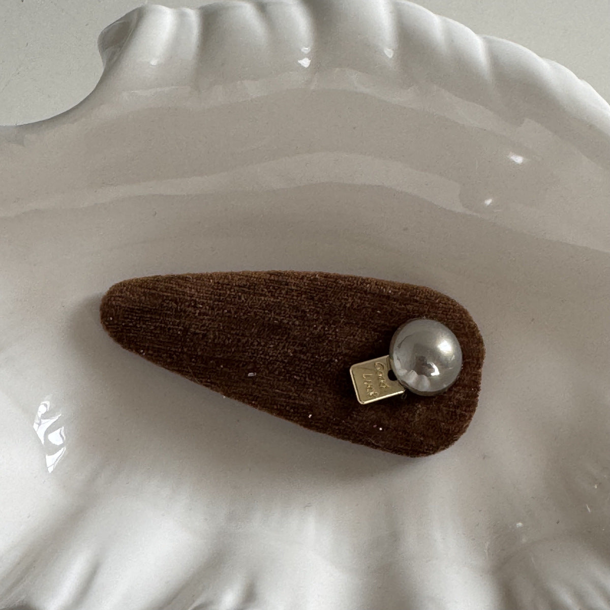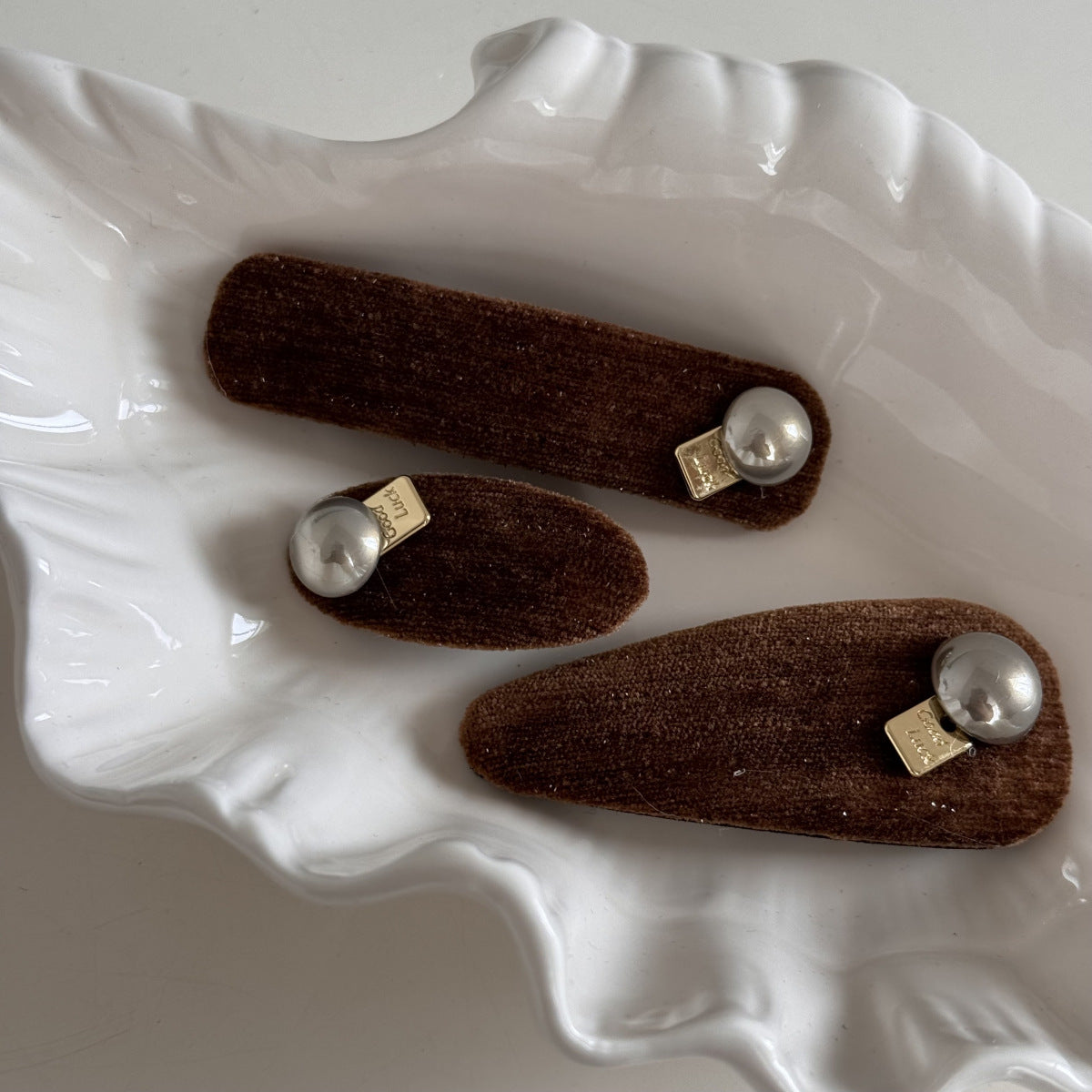 This elegant hair clip features coffee-colored velvet adorned with pearls and gold accents, creating a vintage French-inspired look. Ideal for securing bangs or styling the side, it adds a sophisticated touch to autumn and winter hairstyles.