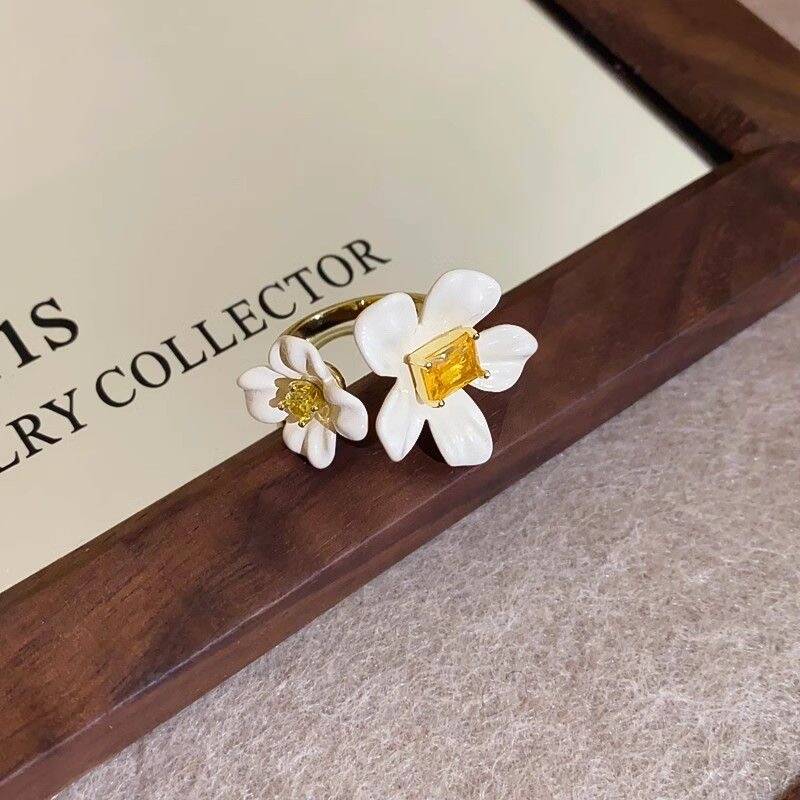 An elegant ring with white zircon petals. Adjustable fit, adding a delicate floral sparkle to any look.